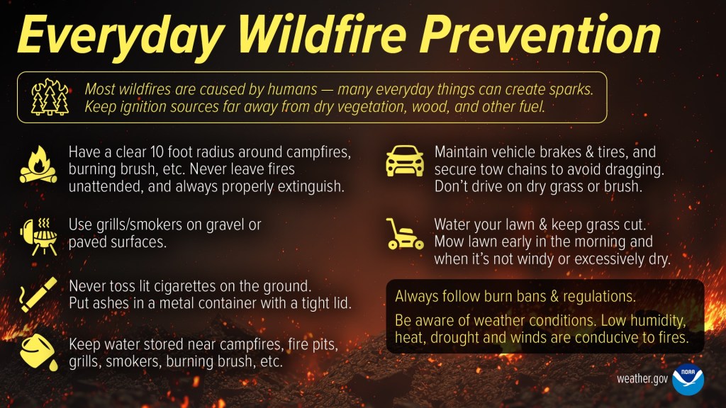 While this week we will celebrate the Labor Day holiday and enjoy a day off, the wildfires won’t. The wildfire risk has increased from August to now September, as we are in the peak of wildfire season. I wanted to include some do’s and don’ts when it comes to preventing wildfires.