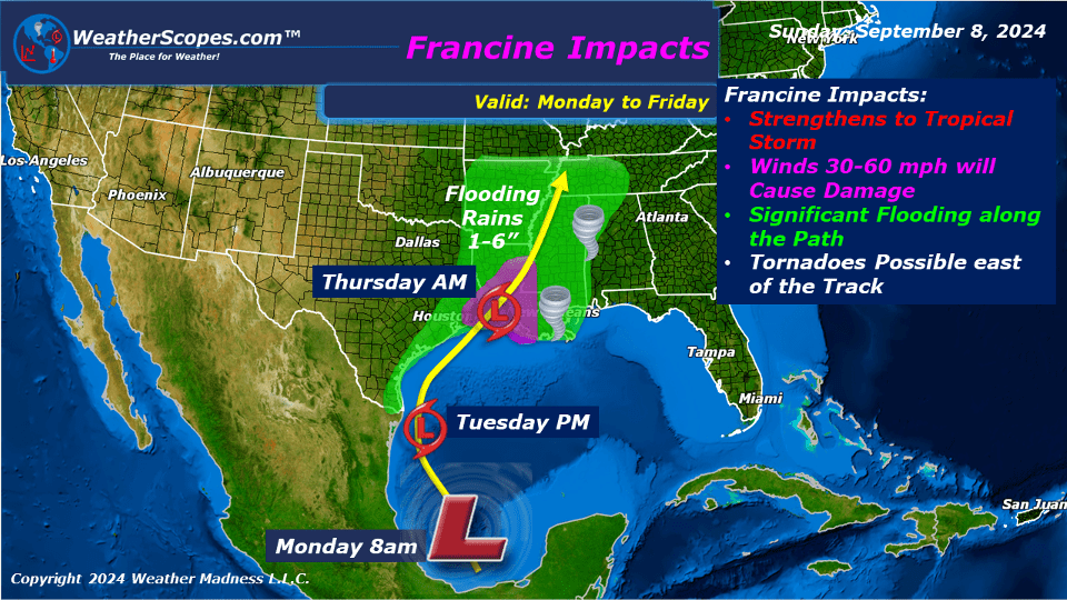 This week the Southeast and Texas continue to get dumped on by a low-pressure system that will produce heavy rain and flooding to an area who has already seen a lot of rain and flooding. Francine is making her way up from the Gulf and is expected to be named in the next day or two. It remains to be seen if Francine will strengthen to a hurricane or just stay a tropical storm. Mid-week we will see Francine impact the Texas and Louisiana Coast for a few days before moving to the North and East. Those areas have already been dealing with heavy rains and flooding for about a week now, so flooding this time from Francine could be catastrophic. As Francine tracks to the North and East we can expect some heavy rains, localized flooding, and some chances of tornadoes. The Mississippi and Tennessee Valley will deal with Francine towards the end of the week.