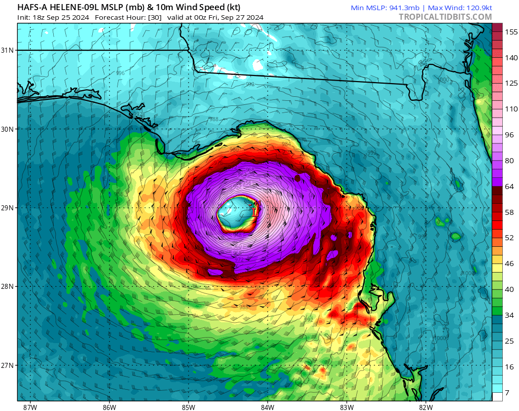 Above you can see the estimated winds as Hurricane Helene makes landfall and the area of heavy flooding up the coast into the Carolinas.