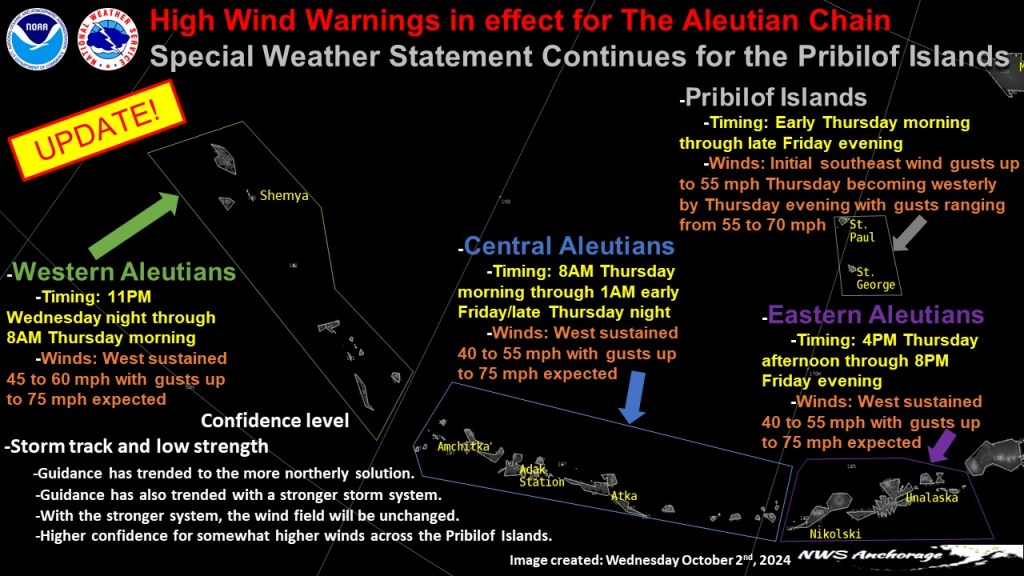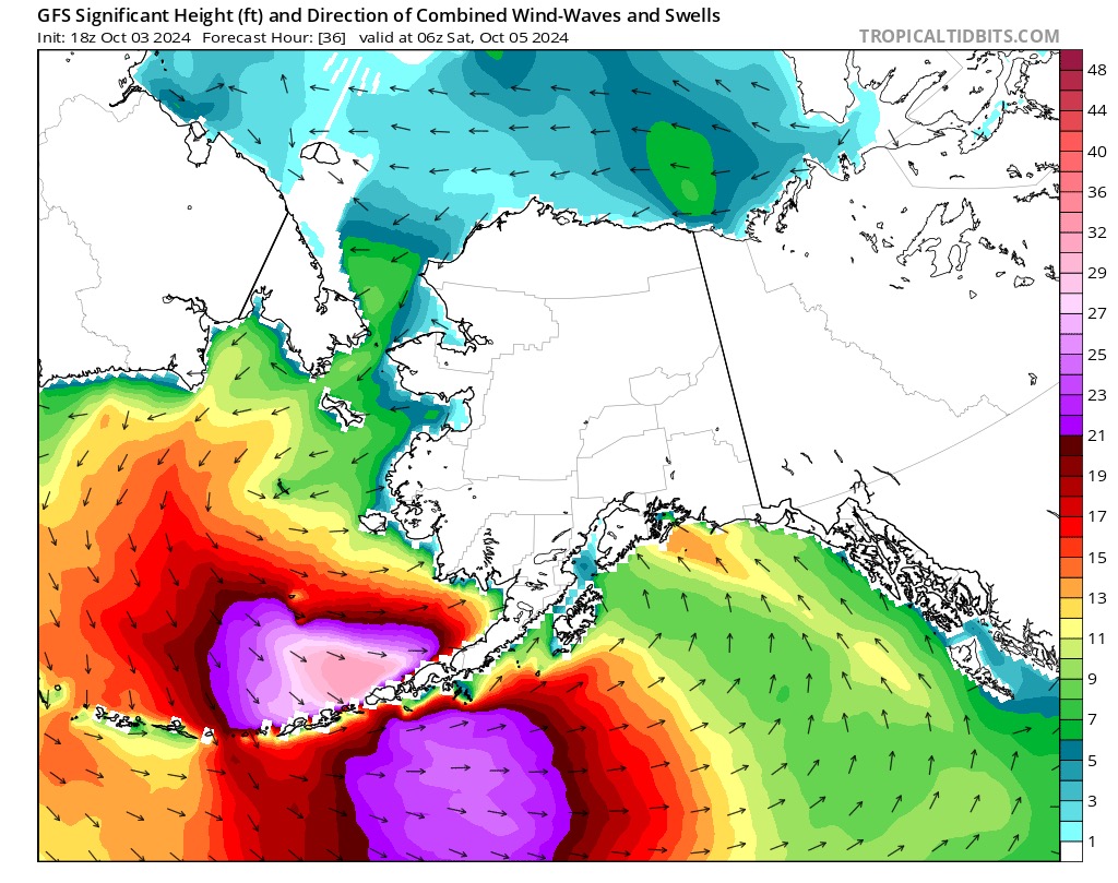We don’t talk about the weather in Alaska often, but there is a powerful mid-lattitude Low that will impact the state for the next 24 hours. The storm is coming off the Bering Sea and will impact the Alaskan Peninsula with strong winds, high tides, and rain. Most of the Aleutians, which is the island chain on the SW tip of Alaska, will be impacted. Most of the Alaskan coast is under a storm warning until tomorrow night due to the high winds and tides. Winds are expected to be 50-60 mph with gusts reaching almost 80mph. The storm surge in the area over the next few hours will surge over 15-20ft. Below you can see the expected surge numbers and warnings from the National Weather Service out of Anchorage.