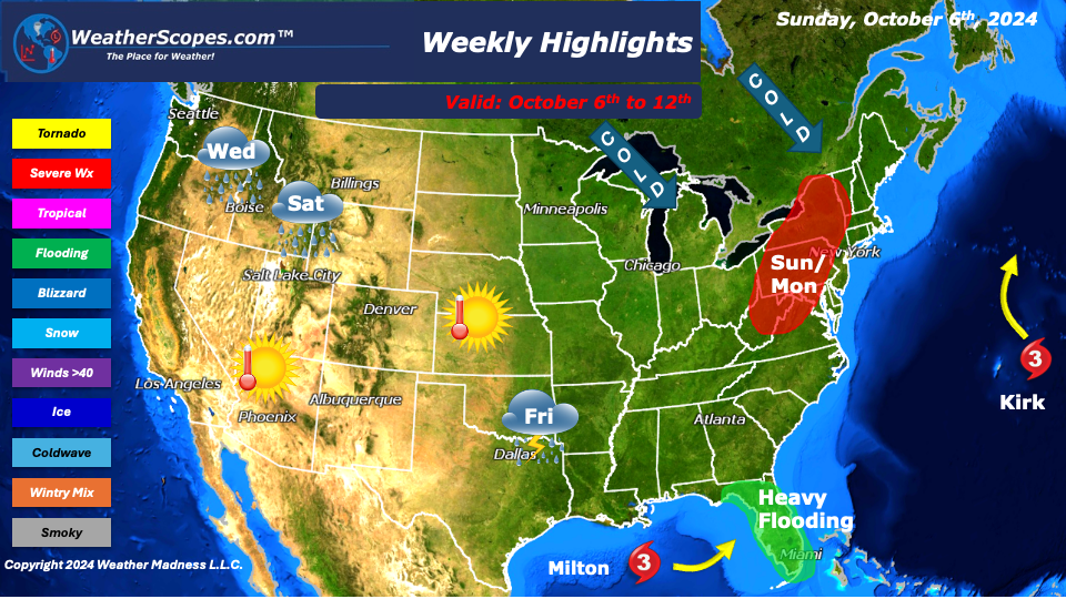 Cold, dry air from Canada will makes its way down and bring the Northeast and Upper Great Lakes some colder temps. The Northeast could see its first frost of the season mid-week, as well as the Upper Great Lakes. The Northeast will also see a round or two of severe weather to start the week. A tornado with these storms isn’t out of the question. The West continues to be sunny, warm, and dry. The Pacific NW will see a round of showers mid-week, and to end the week. The Plains and Midwest will see some nice comfortable weather this week.