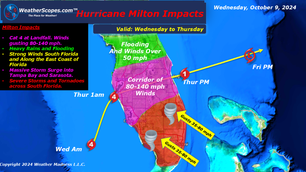 Hurricane Milton now a Category 4 storm with sustained winds at 155mph is set to make landfall in the early morning hours tomorrow. Florida will start to feel the impacts throughout the day today, with rain, wind, and tornadoes. Milton is looking at making landfall in between Tampa Bay and Sarasota. We may see Milton weaken a little to a Category 3 at landfall, but either at a 3 or 4 Milton will be a powerful and dangerous hurricane with catastrophic damage.
