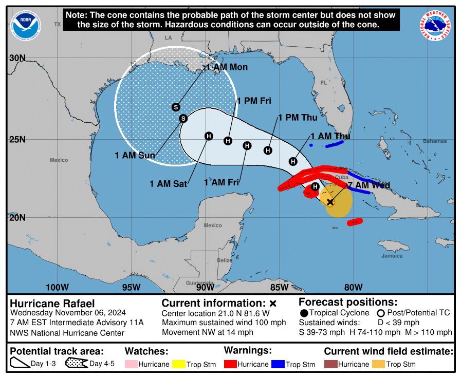 Some rain/snow over Denver today. Tropical Storm Rafael has strengthened to a Cat 1 Hurricane and looks to impact Cuba today.