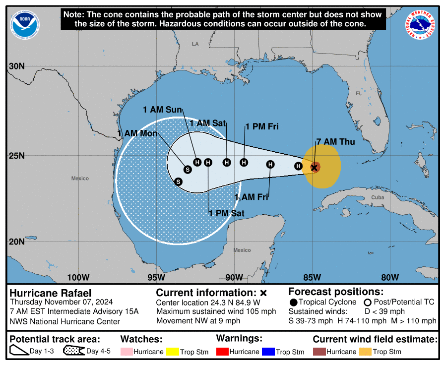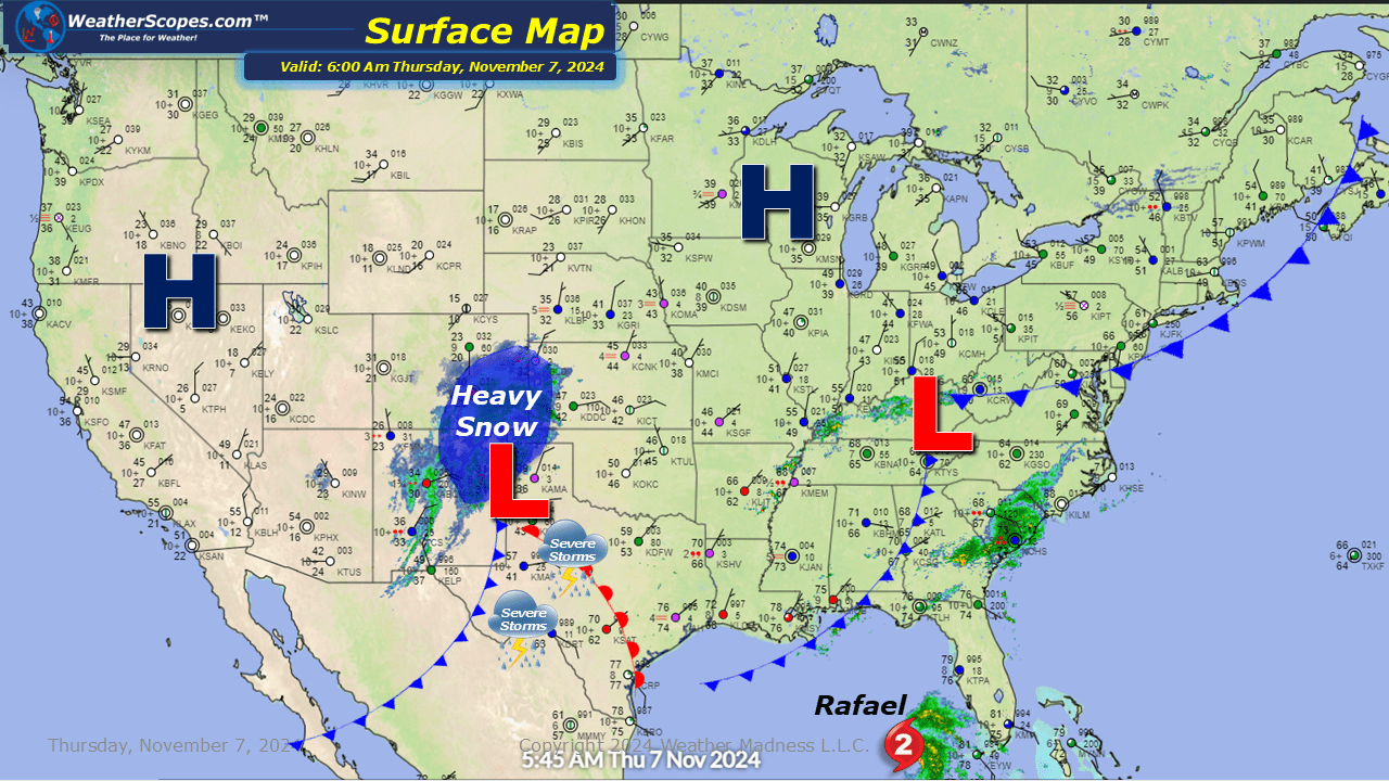 Snow continues to impact Colorado, storms could turn severe in Texas today. Hurricane Rafael has weakened slightly after making landfall in Cuba. We’ll continue to follow what Rafael does while in the Gulf.
