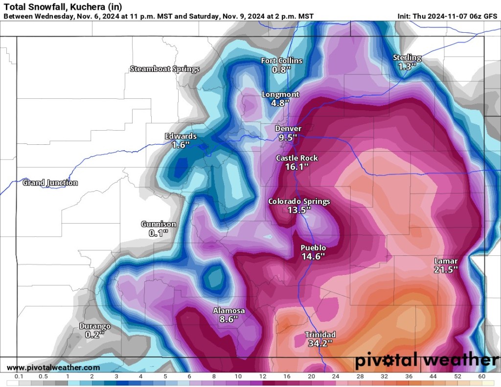 The Denver metro area is no stranger to snow and snow storms. Predicting snow for the area gets pretty tricky when the Rockies play a major factor into the forecasts. The Denver metro had high dew point temperatures, which helped draw moisture into the storm. The La Junta Low also played a factor into this storm. “La Junta Low” is sometimes used to describe a low-pressure system that forms in this area or nearby parts of the Great Plains. This low-pressure system can influence weather patterns, such as temperature drops, wind shifts, and potentially snow or rain, depending on the time of year. This phenomenon is typically associated with the interaction of different air masses—cold, dry air from the north and warmer, moister air from the south—which can lead to dynamic weather changes. These two factors along with up-sloping moisture, where moist air is forced to rise along the Eastern slope of the Rockies are helping this snow storm. The Rockies act like a ramp to lift the air upwards which cools due to the decrease in temperature with altitude. The cooling causes moisture in the air to condense into clouds. If the process is strong enough and there is enough moisture in the air, condensation can result in precipitation, snow in this case. We see this more pronounced in colder months along the Front Range. All these factors, along with a very slow moving storm over the course of 24-36 hours, is helping increase the snow totals to the Denver Metro area.