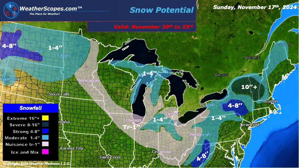 The Pacific NW continues to see a lot of rain and snow in the Higher elevations of the Rockies. Throughout the week snow in the Rockies could top out at around 3ft of accumulation. Parts of Montana will also see some significant accumulating snow. The Denver area will also see a few inches of snow this week as well. For the Denver metro area, I don’t think this round of snow will be anything like the snowstorm they saw a few weeks ago. The next two weeks looks to be a busy weather pattern with more and more accumulating snow falling to much of the US.
