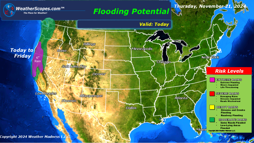 Snow will impact the Great Lakes, the Ohio Valley and move into the Northeast today bringing several inches of snow accumulation. The Pac NW still continues to deal with heavy rain and flooding.