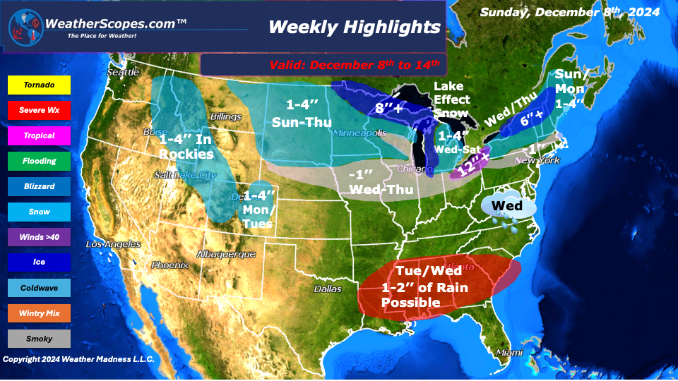 On Sunday, parts of the Northeast and Maine will see some snow accumulations around 1-3’’. The Upper Plains/Great Lakes will see rain turn into snow throughout the day with some accumulations of around 1-4’’. The Great Lakes, UP of Michigan, and Northern Minnesota could see 6’’+ throughout the week with some snow and lake effect snow bands moving in. Parts of Wisconsin, Illinois, Iowa, and Indiana will see a dusting mid-week. The Cleveland/Buffalo area could see 12’’+ this week from a few days of snow and lake effect snow bands.