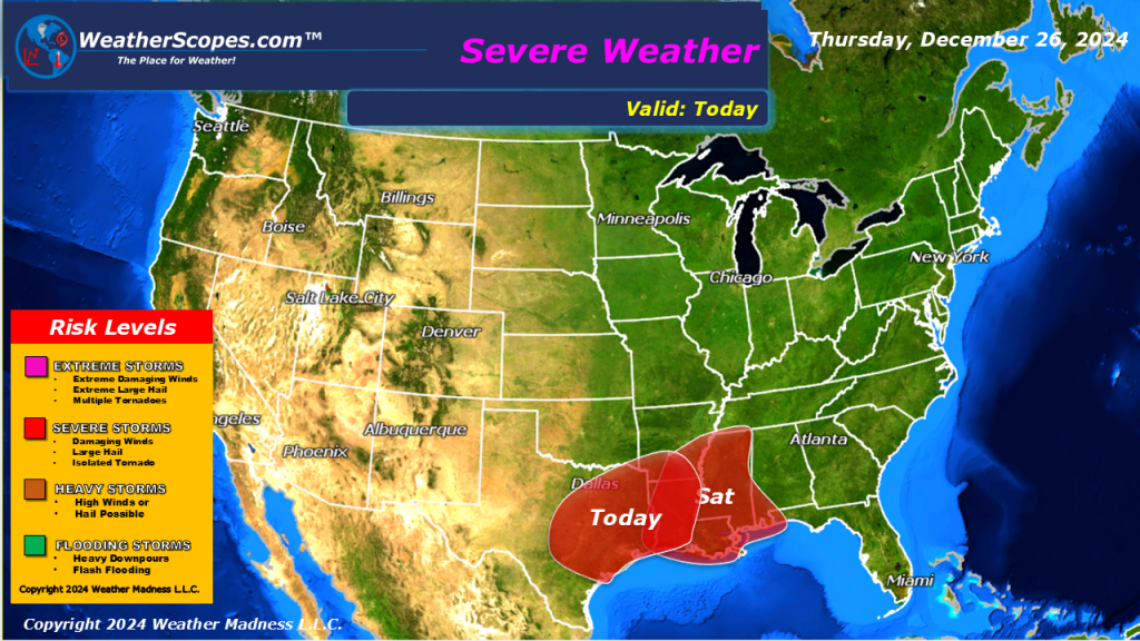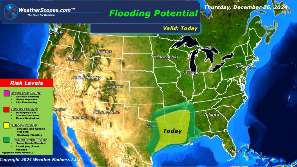 Hope everyone has a good Holiday! Today some storms will develop in Texas and make their way through the Mississippi Valley, and could be severe. Some localized flooding in the area is not out of the question. Rain and snow continue to impact the Pacific NW, with snow and windy conditions in the Northern Rockies. Some mixed precipitation in the Green Bay Area could bring some freezing rain to the area.