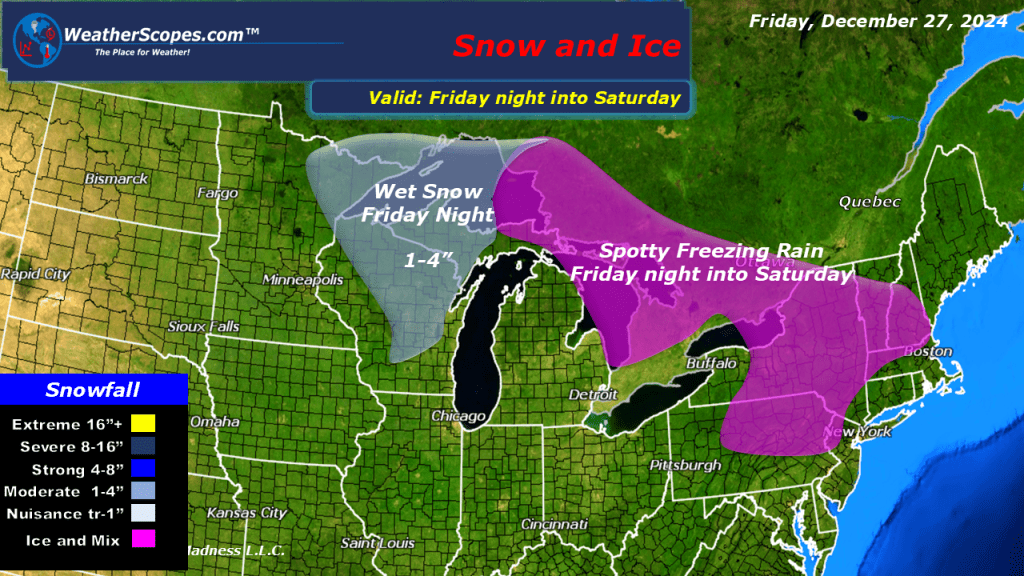 Rain in the Midwest and Great Lakes today, stretching down to New Orleans. Rain and snow continue in the Pacific NW and Northern Rockies. Late tonight and into tomorrow the Northeast could see some freeing rain, and icy conditions. Also later tonight the northern parts of Wisconsin, Michigan, and Minnesota could see the rain turn into snow with some accumulations of 1-4”.