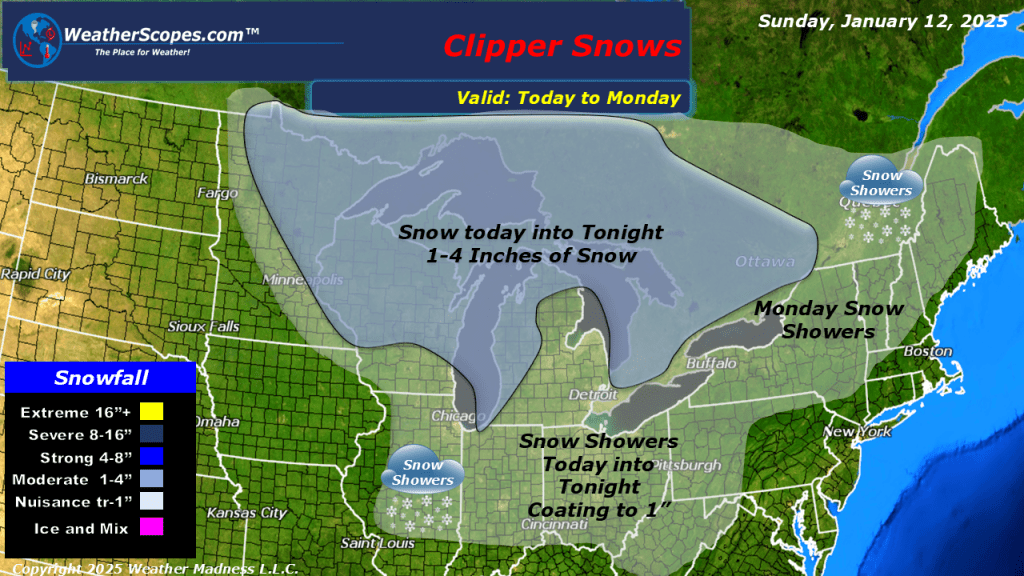 A clipper coming through the Great Lakes today, bringing some cold, cold weather on the back end. Accumulations look to be a coating around Chicago and into the Ohio Valley, to 1-4” in the Northern areas of the Great Lakes. This clipper will move through the area and impact parts of the Northeast tomorrow morning, bringing some snow showers.