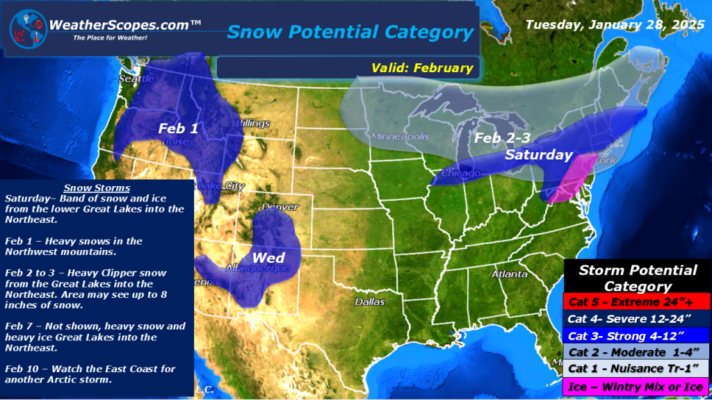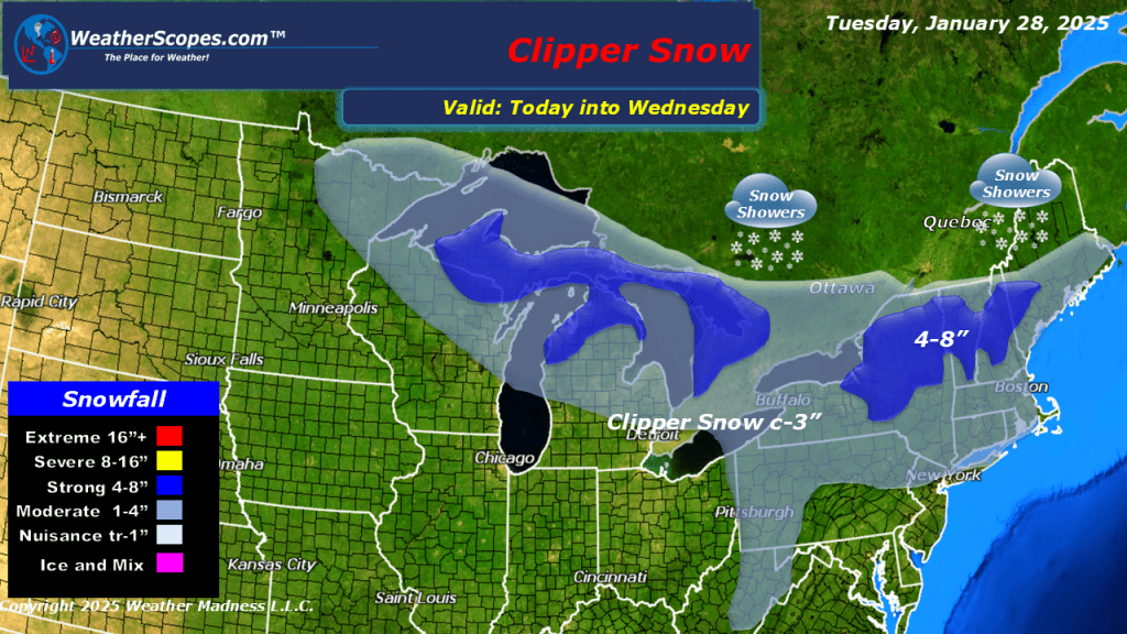 Some snow showers falling in the Northeast with a clipper making its way through the Great Lakes today. That clipper will come through the Northeast as well today into tonight. Accumulations look to be a coating to 3” in the Northeast, and 1-4” in the Upper Great Lakes, especially the UP of Michigan which could see 4”+. The clipper will bring some windy conditions with gusts 30-40mph, creating some dangerous driving conditions. Over the next few days the Northeast and Great Lakes will see a few clippers come through the area. Some milder weather in the Plains and Midwest with temps in the high 30’s/ 40’s, with some areas seeing 50 degrees.