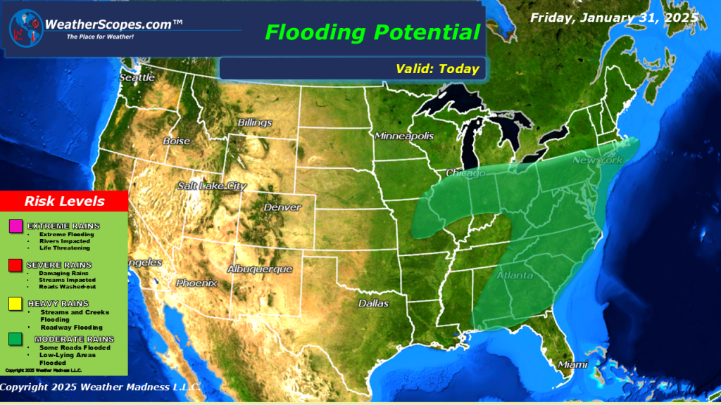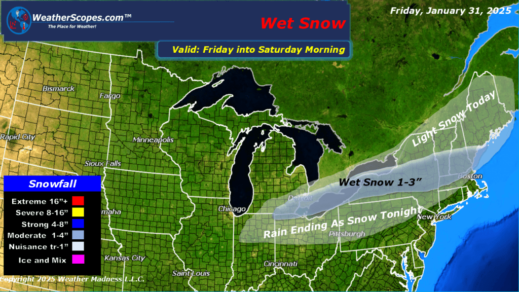 Rain across the Midwest, parts of the Southeast through the Tennessee Valley, and the Northeast. The rain in the Northeast will turn to snow later today and into tonight. Accumulations look to be around a coating to 3”. These areas have had a lot of rain the last 24 hours, some localized flooding is possible. System coming into the Pacific NW that will bring rain to the area, and snow in the mountains.