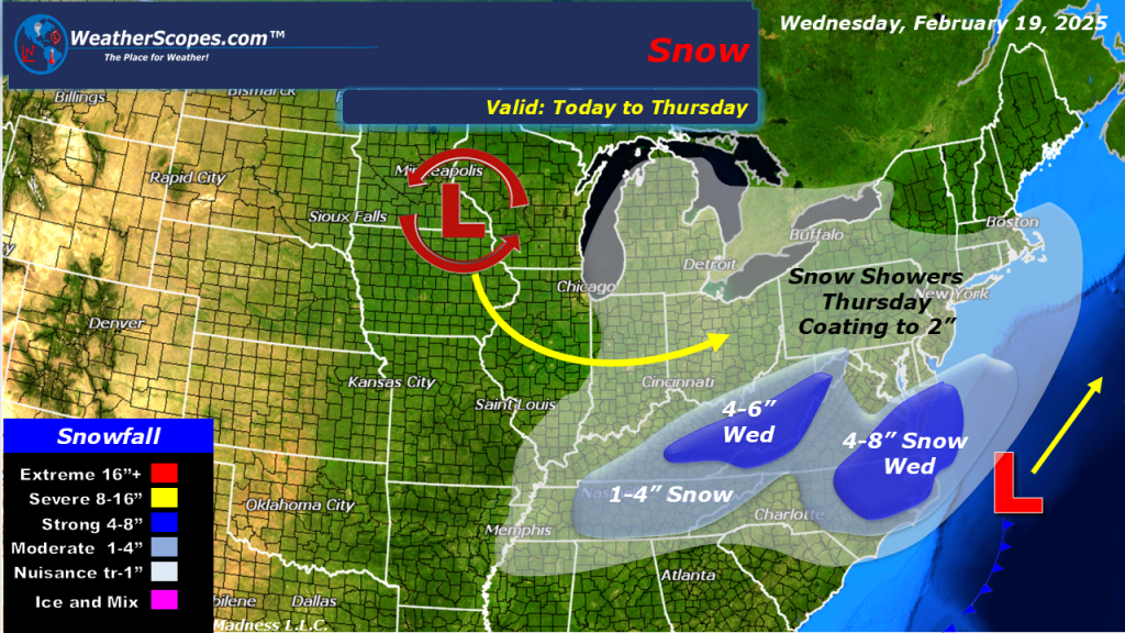 Still dealing with cold temps throughout the Plains into the Great Lakes and Northeast. Some snow making its way across the Ohio and Tennessee Valley today and into tonight. Accumulations look to be a coating to 4” for most of the Ohio and Tennessee Valley with some higher amounts near the Kentucky / West Virginia border. Also some parts of northern North Carolina into Virginia and Delaware could see 4-8” of accumulating snow from this storm. Some rain and thunderstorms will develop in the Gulf Coast states today with the chance of some severe weather to the area.