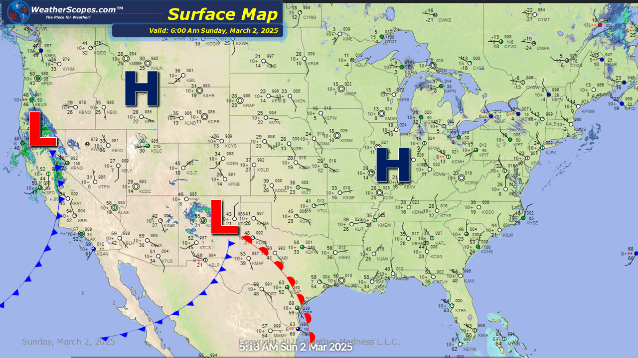 An overall quiet weather day. Some light snow showers in Michigan into the Cleveland area. Colder temps back in the Great Lakes and Northeast, while the Plains and the South continue to be mild. A stormy and snowy week ahead.