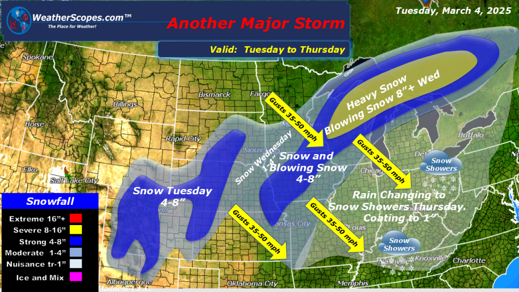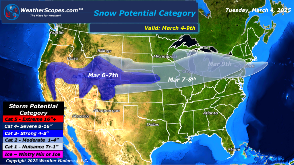 A robust weather day today. We have rain and thunderstorms in the Mississippi Valley that will produce some severe weather and some tornadoes, especially in the Louisiana area. Those storms will continue to the east today and tomorrow affecting the Tennessee Valley and Mid-Atlantic states. In the Plains we have snow that will produce around 1-4” of accumulations. That system will then move into the Great Lakes later tonight and into tomorrow. Accumulations look to be around 1-4” in the Great Lakes.