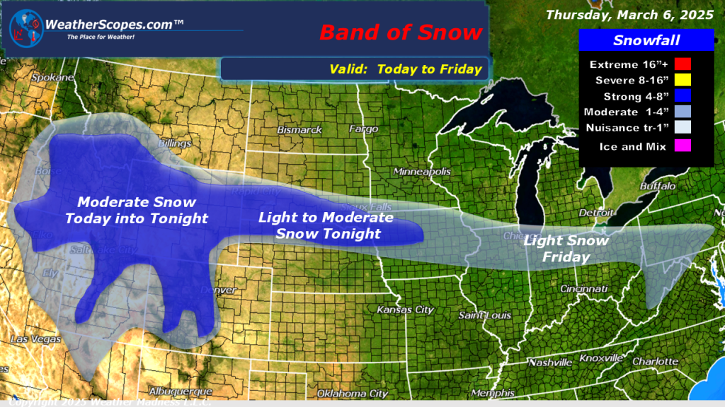 Some leftover snow in the Great Lakes and Cleveland area. Accumulations look to be around a coating to a 1”. Some snow in the Rockies today. Later tonight a clipper will come through the Plains and into the Midwest. Heavier accumulations will be out in the Plains and NW Iowa, while the Midwest will see a coating to start the weekend.