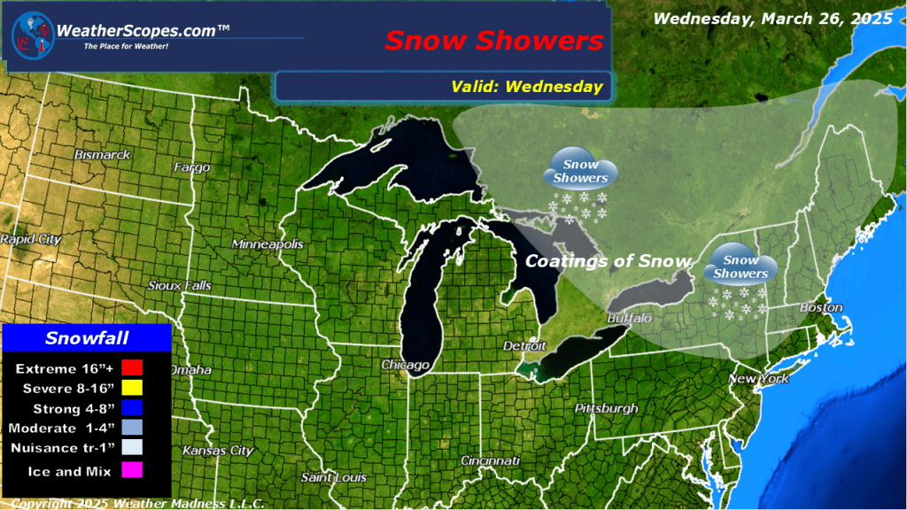 Some light snow showers coming through the Northeast today. Accumulations look to be only a coating. Some rain and thunderstorms developing in Southern Texas today and into tomorrow, that will bring heavy rains to the area. An overall nice day across the US with some milder temps returning for most of us.