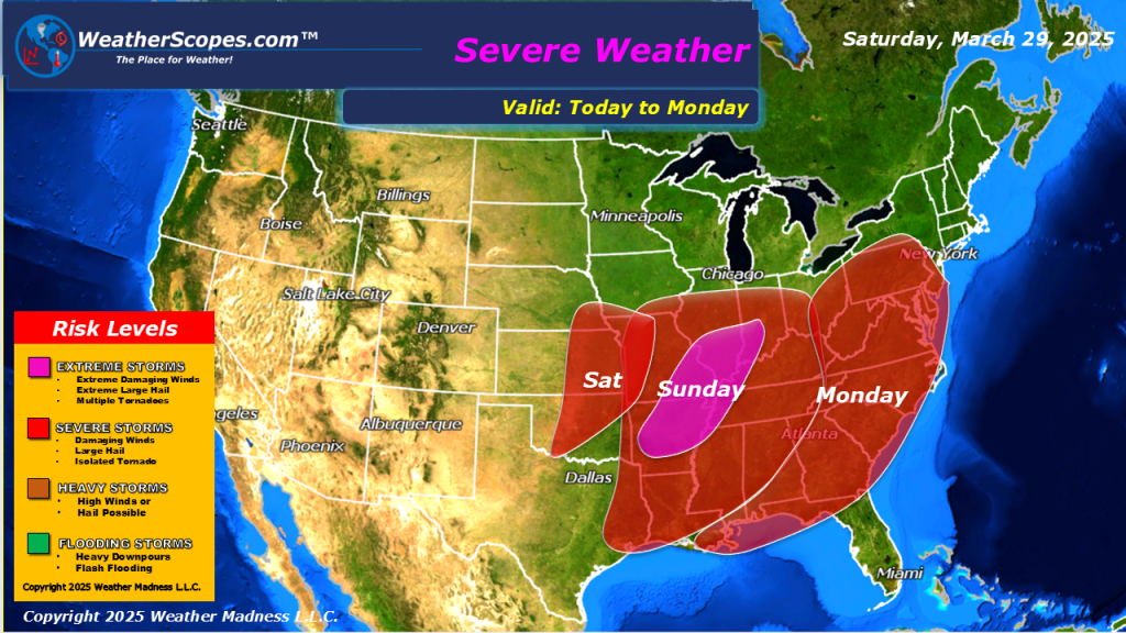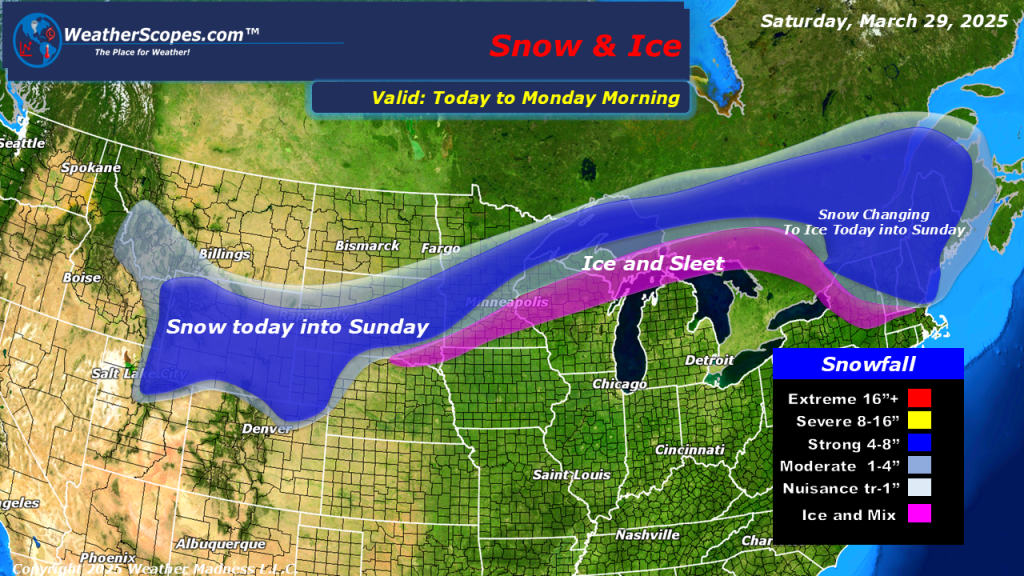 Today we have snow and some mixed precipitation coming through parts of the Northeast. Parts of Upstate NY, Vermont, New Hampshire, and Maine could see over 4” of snow and some ice. We have some thunderstorms moving through the Plains into the Midwest and Ohio Valley today, as well as the Mississippi Valley, today and into the overnight hours. Some of the storms in the Mississippi Valley could be severe today and will set up a severe weather outbreak tomorrow.