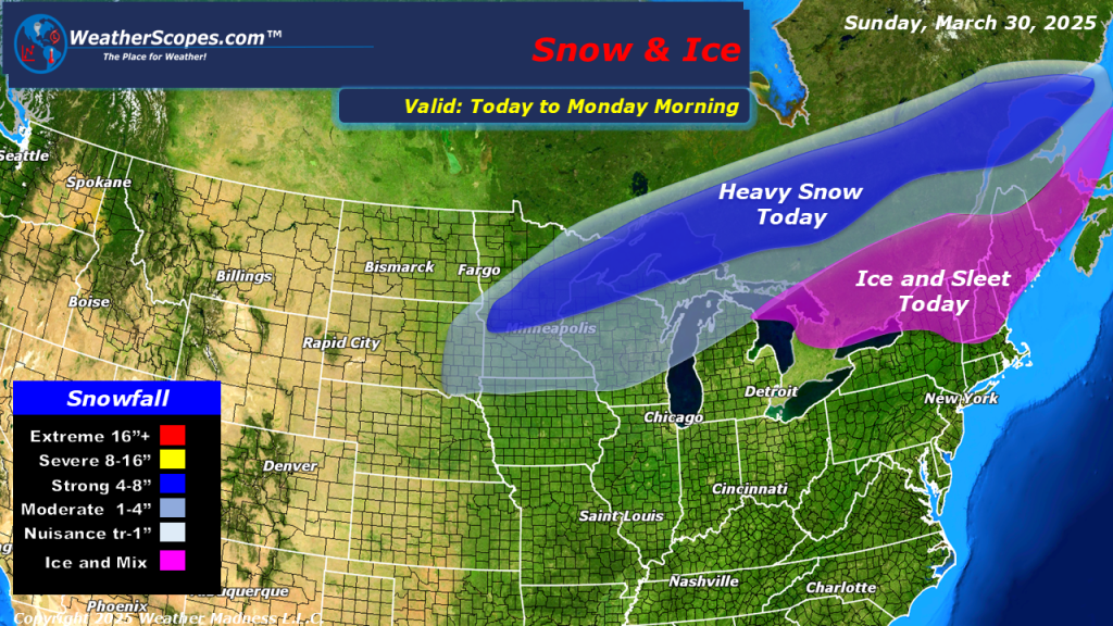 Today snow and ice will impact parts of the Northeast from NY to Maine. Accumulations look to be around 1” for snow and .10” of ice. That system extends all the way back to the Upper Great Lakes for parts of WI, MN, and the UP of Michigan that will see snow and ice. Accumulations look to be around a coating and 2-4” for the UP of Michigan. In the Mississippi Valley today some severe weather will break out. Gusty storms and hail will be the main concern along with tornadoes. These storms will develop and move to the East into the Tennessee and Ohio Valleys.