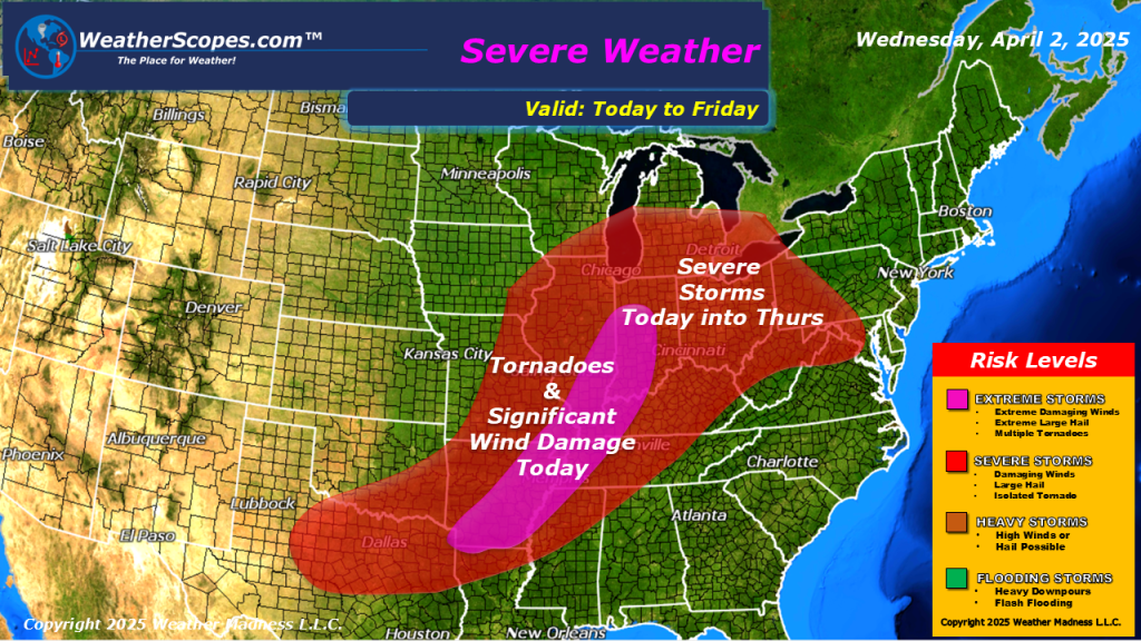 A busy weather day today. Storms have already developed in the Plains overnight and currently. They produced a few tornadoes in Kansas. Those storms will continue in the Midwest down into the Mississippi and Ohio Valley today. Severe weather and tornadoes will be prevalent today. Gusty winds, hail, and heavy rain will also be associated with these storms. The Ohio and Mississippi Valley’s could see several inches of rain from these storms, and could have some very dangerous flooding. Today will be interesting to see just how many tornadoes develop and the amount of severe weather and rain these areas see.
