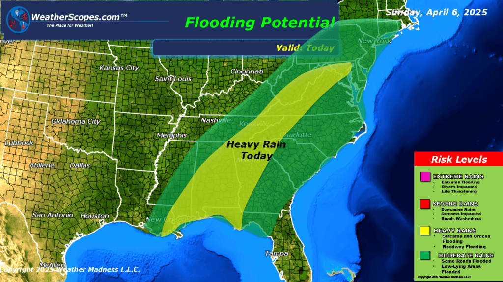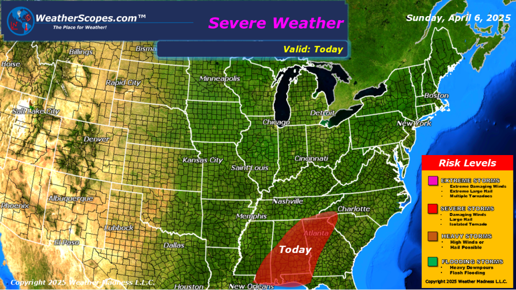 Today some severe weather and heavy rainfall in the Southeast to Mid-Atlantic states. Some areas could see 2-3” of rain in 24 hours. Some localized flooding will be an issue with these storms. Severe weather today focused around Alabama with the chance for some hail, gusty storms, and tornadoes. A nice day today for those in the West, while the Northern Plains into the Great Lakes and Northeast, will see some cooler temps move in for most of the week.