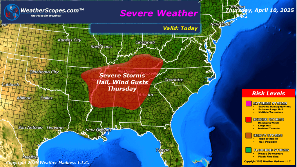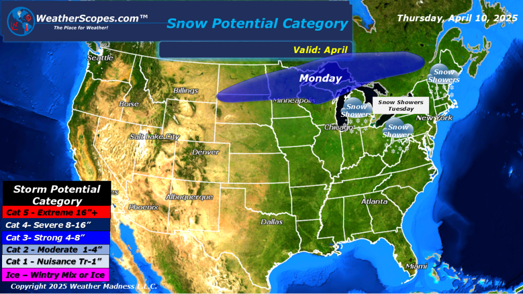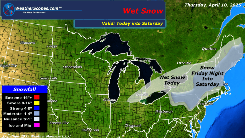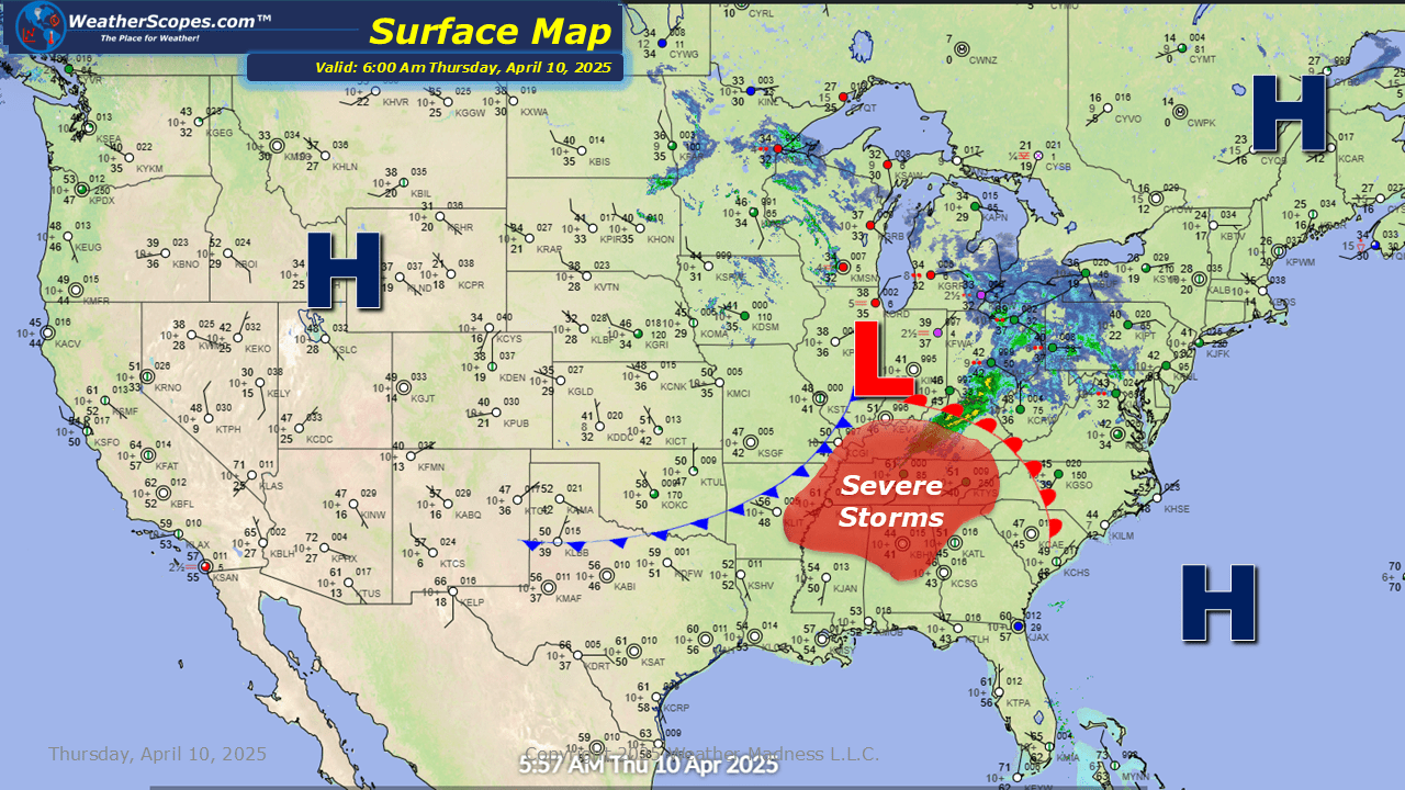 A nice day for most of the US today. The Plains, Great Lakes, and Northeast still dealing with cooler temps. Snow showers across Eastern Michigan into parts of NY today with accumulations of around 1”. Showers and thunderstorms making their way across the Tennessee and Ohio Valley’s this morning into the Mid-Atlantic states and Northeast. Later tonight some storms will develop in the Tennessee Valley and make their way to the east. With these storms the dew points won’t be high enough to produce any tornadoes, but some gusty, hail producing storms are possible.