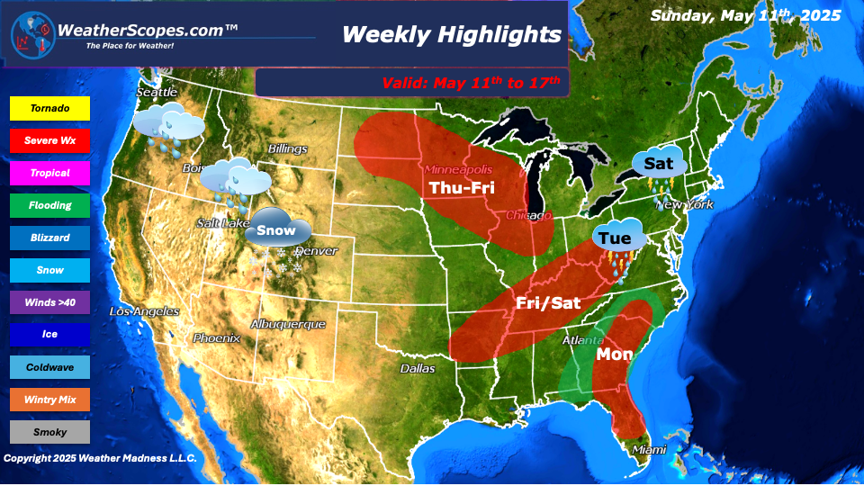 Thursday into Friday showers and thunderstorms will develop in the High Plains and move into parts of the Great Lakes and Midwest. Those storms look to be severe and could produce some hail, gusty winds, and a tornado is not out of the question. Friday into Saturday, the system in the Great Lakes moves into parts of the Northeast into the Ohio and Tennessee Valley, and more storms will develop in the Mississippi valley. There will be a chance for these storms to become severe. Hail, gusty winds, and tornadoes will all be in play with these storms as warmer temps and higher dew points will increase.