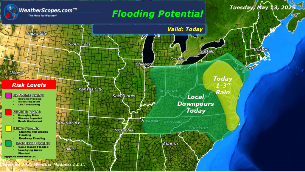 Showers and thunderstorms moving across the Mid-Atlantic states into the Ohio and Tennessee Valleys today bringing some heavy downpours at times, and the continued risk for localized flooding. Rain and snow out west across the Rockies. Higher elevations of the Rockies will see a good amount of snow over the next day or so, and well as portions of North Dakota up through Canada. Rest of the US looks warm and relatively dry.