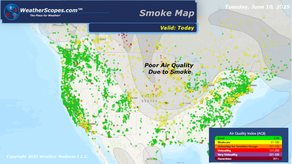 This morning we are already seeing showers and thunderstorms out across central Texas and parts of the Northeast. Texas looks to see several inches of rain in the next few days with daily occurrences of storms coming in. Flooding will be an issue in the coming days for the southern portions of Texas. Later tonight severe storms will come through Texas with hail and damaging winds. The Plains into the Great Lakes still dealing with the smoke from the Canadian wildfires. Nothing forming in the tropics as we continue to watch to see if anything develops.