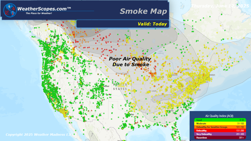 Today we are seeing Southern Texas dealing with heavy rains moving through and flooding issues, as that area has seen several inches of rain this week. Those showers and thunderstorms will move into the Mississippi Valley today. We have some showers and thunderstorms up in the Northern Plains moving into the Upper Great Lakes today. Some of those storms could be severe. Much of the Midwest into the Northeast still dealing with air quality issues from the smoke coming down from the Canadian wildfires.