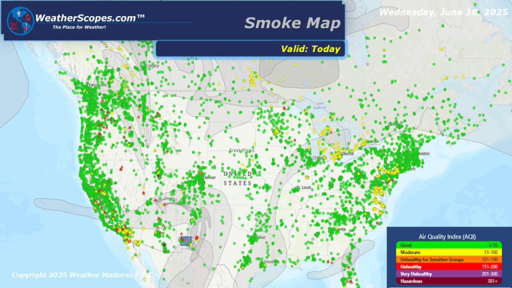 Today more severe storms will develop out across the Midwest into the Tennessee and Mississippi Valleys’s. These storms will bring heavy rains, hail, gusty conditions, and tornadoes. With the heavy rains in the Midwest, expect to see some flooding potential. These storms will be ongoing for most of the day and into the evening. The air quality from the Canadian wildfires looks to be slowly improving. Most of the US will see warm mild conditions continue today, with areas in the South and Southwest seeing temps over 100.