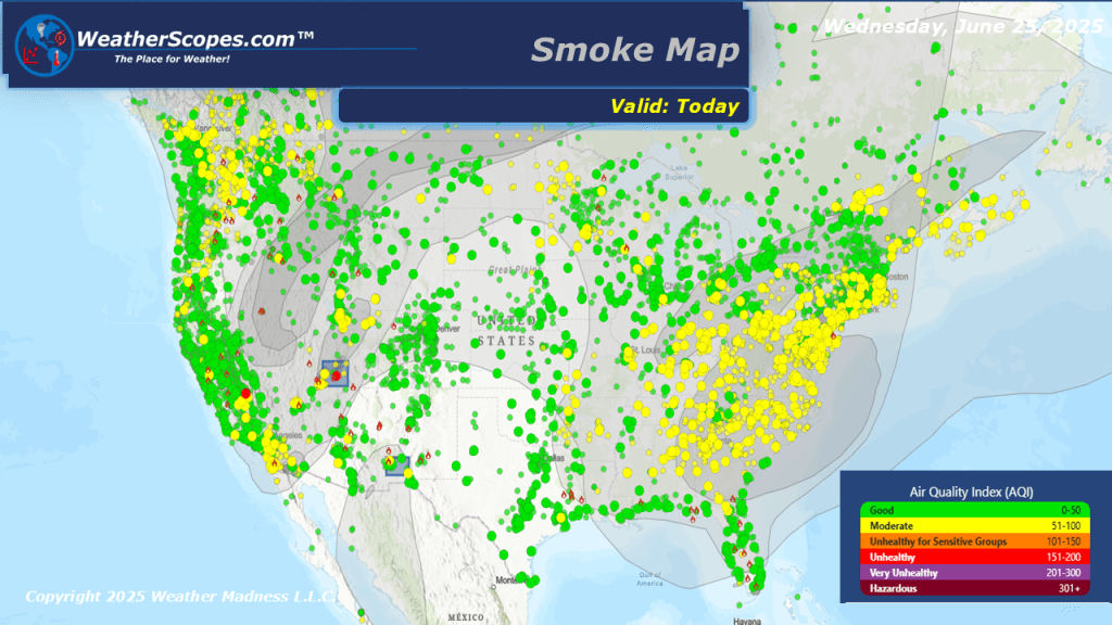 Today storms will impact New Mexico into Colorado for another day causing some gusty storms and some flooding. Storms will develop from the Plains through the Midwest and into the Northeast and Mid-Atlantic states. We will also see storms in the Southeast. Some of these storms look to be severe in the Plains and areas of the Southeast, bringing some gusty conditions and the threat of hail. Dew point temps in these areas will be high today, so you can’t rule out a few tornadoes coming from these storms. Smoke map showing some slight better air quality but still some moderate air quality in the East with how hots it has been in the region. Nothing going on in the tropics over the next few days and most likely into next month.
