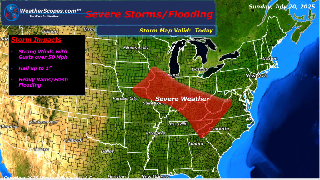 Today we will see some severe storms break out across the Midwest into the Ohio Valley and into parts of the Mid-Atlantic States. Heavy rains, winds, and hail will also be hazards with these storms. Later today more storms will develop in the Northern Plains, which could become severe. Still watching the tropics this week to see if anything forms. The week ahead looks to be warm and humid for the central part of the US.