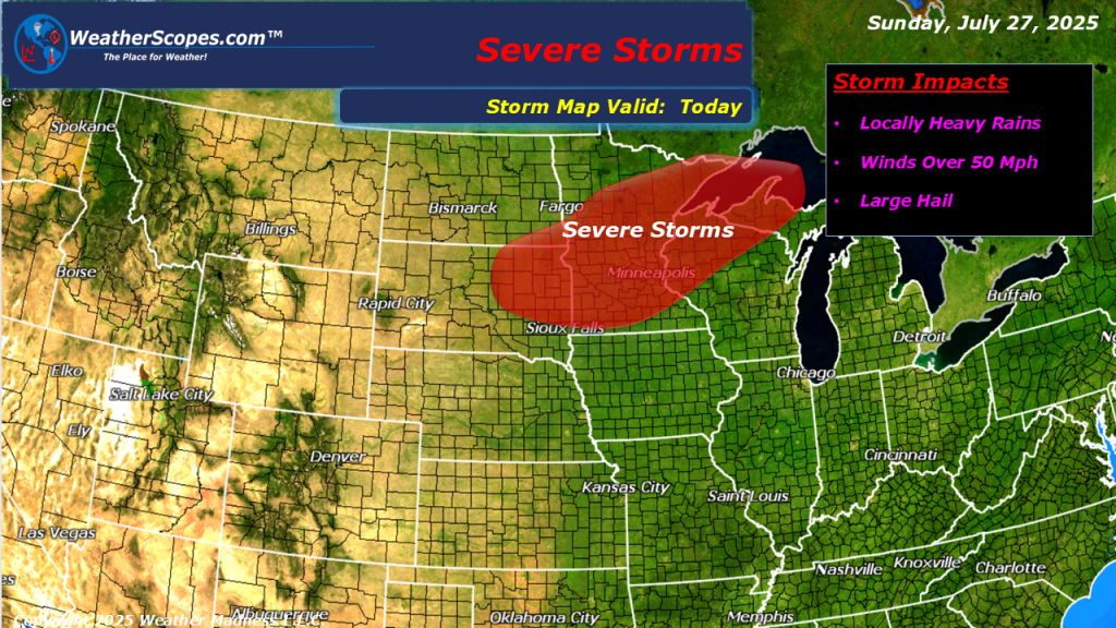 Today we’ll see some storms develop in the Northern Plains into the Upper Great Lakes, bringing some gusty storms and heavy rains. That area could see severe weather over the next few days, as the warm moist air from the Gulf will drive these storms to the north. The Mid-Atlantic states could see some gusty storms this afternoon, and some heavy downpours. Most of the US today will see hot and humid conditions. Nothing going on in the tropics for the next several days.