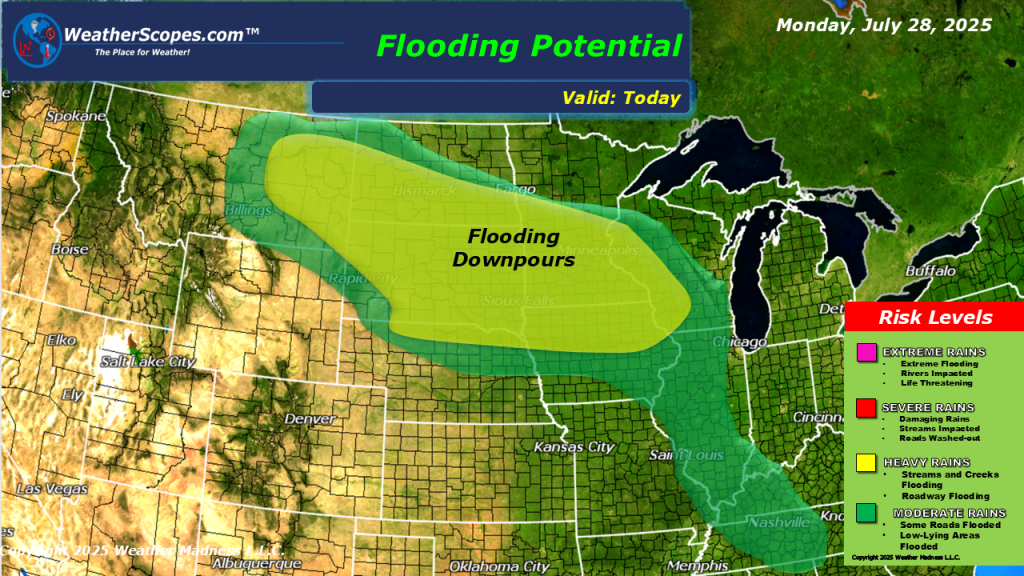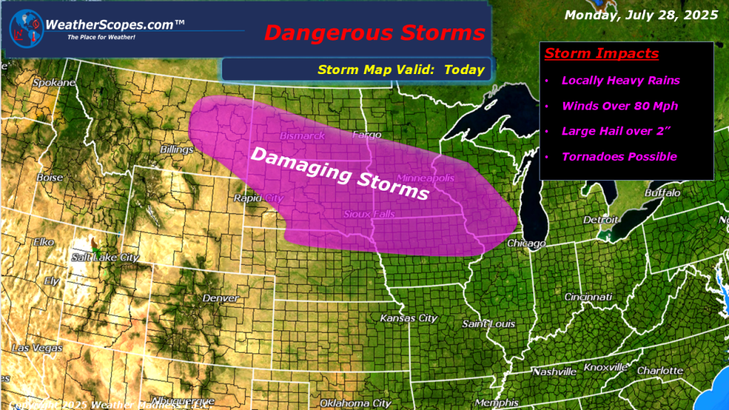 Today damaging storms look to develop in the Northern Plains and extend into parts of the Great Lakes. Heavy rains, hail, winds over 80mph, and tornadoes will all be in play with these storms. With the heavy rains localized flooding will also be a hazard. The Northern Plains into the Great Lakes will see severe weather over the next few days. Later today some scattered showers and thunderstorms will develop in the Southeast, some could become severe. Another hot and humid day for most of the US once again, with a break coming towards the end of the week.