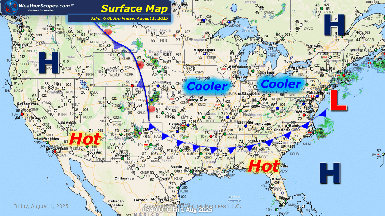 Today we’ll see storms develop in the Central Plains, and in the Mid-Atlantic States. The storms across the Mid-Atlantic states will bring some gusty conditions, while the storms out in the Plains will bring hail, gusts over 50mph, and a tornado is not out of the question. Heavy rains will also be an area of concern in the Mid-Atlantic states. Some cooler and less humid conditions today for the eastern part of the US, while the heat continues to be in the south and west.