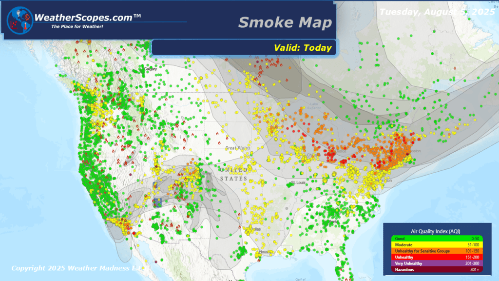 Today more severe weather will break out in the High Plains, brining gusty conditions, hail, and the threat of a tornado or two. The Southeast continues to see heavy rains and possible localized flooding. The Ohio Valley could see some isolated thunderstorms develop later in the day. The air quality for the Midwest, Great Lakes, and parts of the Northeast continue to decline. The wildfires in Canada continue to burn and the smoke continues to make its way further south. The wildfires that we have going on in the west continue to burn and the smoke is making its way east into parts of Texas. Tropical Storm Dexter is out doing its thing in the Atlantic. The heat and humidity looks to return to parts of the Plains and Midwest.