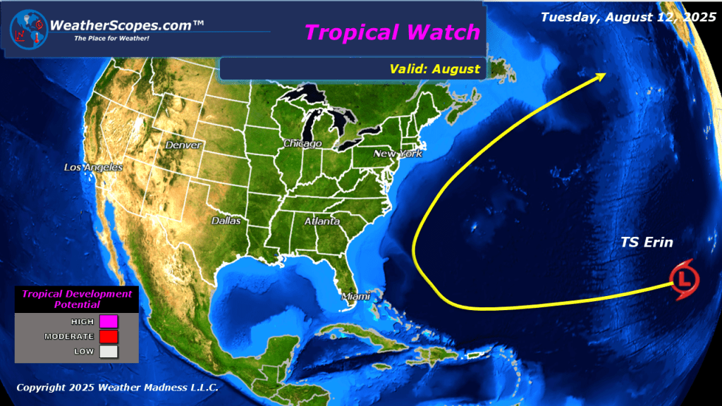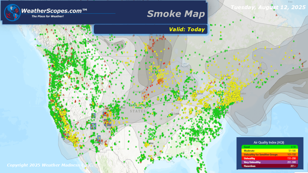Today some showers and thunderstorms in the Midwest and into the Great Lakes. These storms will bring some gusty conditions and heavy rains. Some localized flooding could be an issue to watch for. The heat and humidity returns to the East today, and continues in the West. The wildfires continue to burn in the West and in Canada. The smoke from both regions has consumed much of the US with a haze and burning smell, making air quality in some areas poor. TS Erin continues in the Atlantic, and does not currently pose a threat to the US.