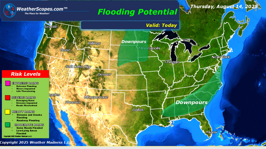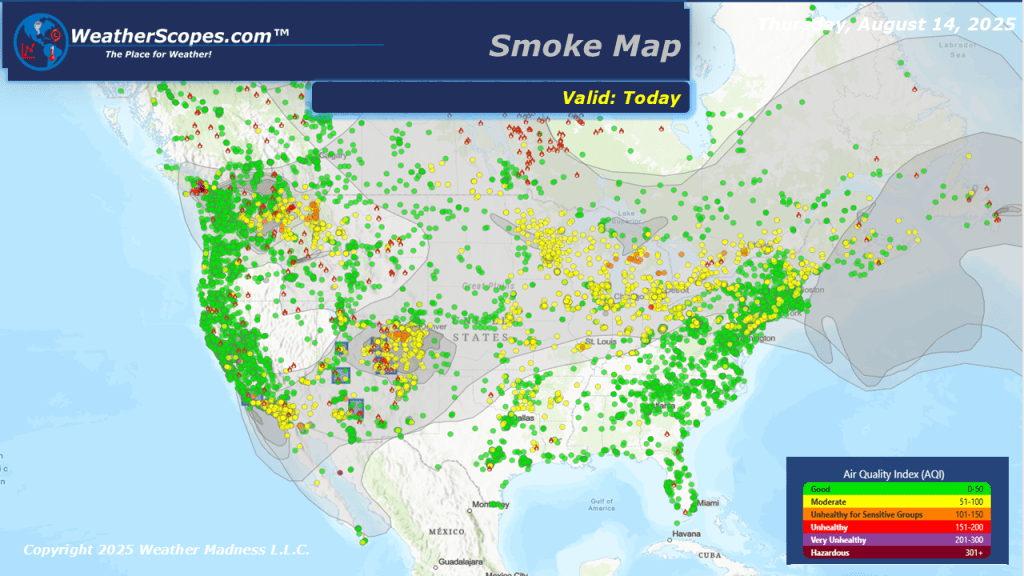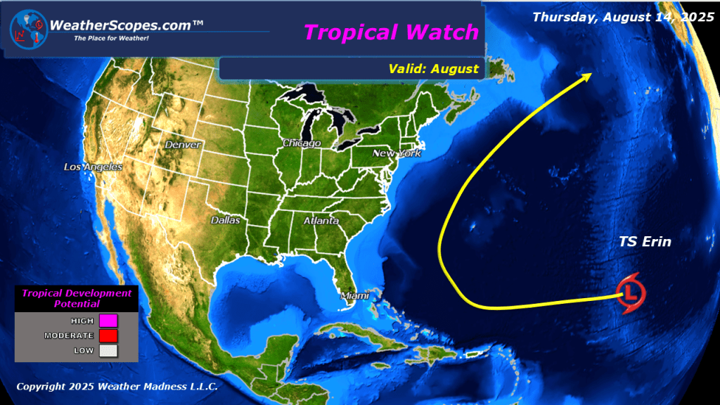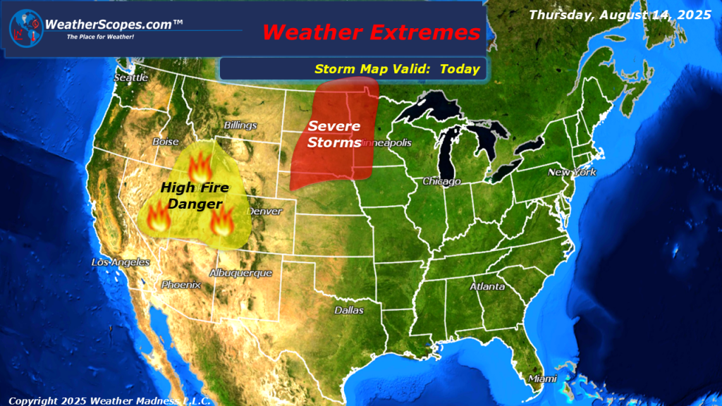 Today showers and thunderstorms will develop in the Mid-Atlantic into the Southeast, with some heavy rains at times. Some severe storms will develop in the High Plains and into the Upper Great Lakes. Some locally heavy rains with those storms as well. The west continues to be hot and dry, increasing the fire danger and making it difficult to extinguish the wildfires already burning. TS Erin still in the Atlantic and not likely to pose a threat for the US.
