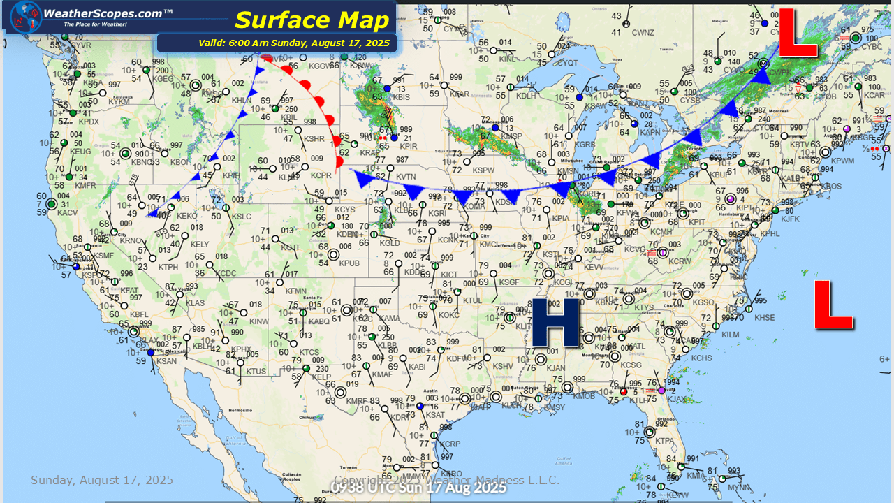 This morning we are already seeing some showers and thunderstorms move through the Plains into the Upper Great Lakes, and parts of the Northeast. We will see those storms produce some gusty conditions and some could become severe. With these storms some heavy rains will also be a concern, and some localized flooding is possible. Wildfire smoke continues for much of the Eastern part of the US. Hurricane Erin now a Cat 3 storm, is impacting portions of Puerto Rico and the Virgin Islands. As Erin tracks to the West NW later this week the Outer Banks of NC could see some winds and outer bands of rain from Erin. Hot and dry conditions out west continue to fuel the wildfires.