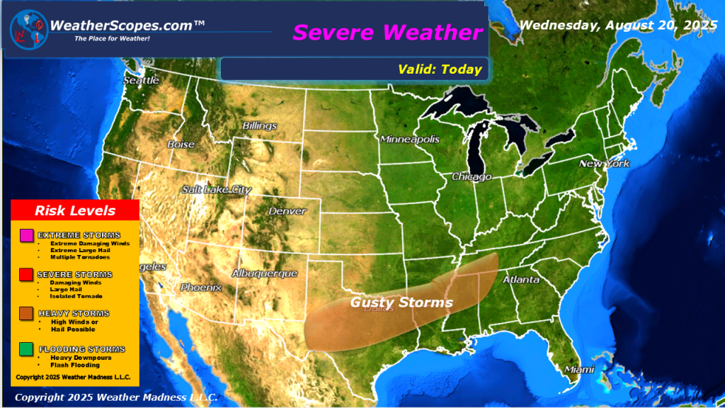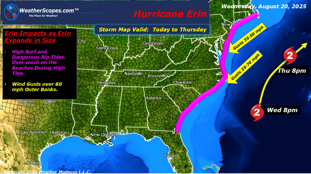 Today we’ll see some gusty storms in Texas through parts of the Southeast. With the gusty storms we could also see some heavy rains and some possible localized flooding. Later tonight the Outer Banks could start to see the outer bands from Hurricane Erin. Erin now a Cat 2 storms is still tracking to the North-Northwest with sustained winds of 100mph. The Outer Banks could see some dangerous rip tides and high surf as Erin makes her way through.