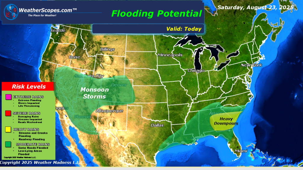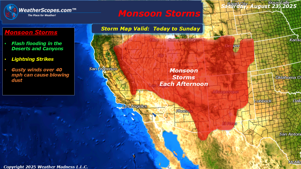 Today the Great Lakes, Tennessee Valley, and the Southeast could see some showers and thunderstorms develop, but nothing severe. The Four Corners States will see some monsoon storms yet again. Some areas could see some localized flooding in the deserts and canyons. Hurricane Erin is gone and the NHC is watching another area in the Atlantic for something to develop. Wildfire smoke getting better in the Eastern part of the US, while out in the West wildfires continue to burn and creating some poor air quality.