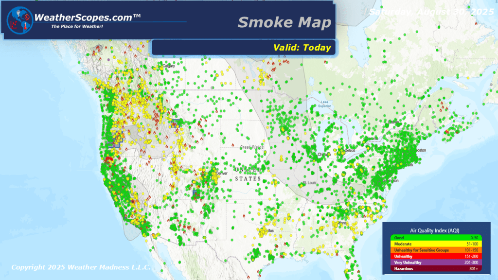This morning we are already seeing showers and thunderstorms across the Plains, the Texas Panhandle, and parts of the Southeast and Northeast. The Plains and Gulf Coast states could see some heavy rains today and localized flooding. Some of those storms could be severe, but no real severe threat today. The smoke in the Pac NW is slowly improving. The tropics are dormant. Some fall like temperatures look to be coming into the Eastern part of the US late next week.