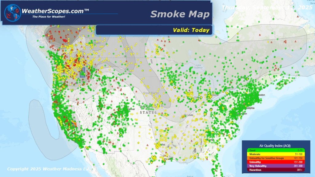 Today the High Plains will see some gusty storms develop. These storms will produce some hail and gusty conditions, some could become severe. This weekend the Southwest could see some localized flooding in some areas due to some showers and thunderstorms. Now the eastern part of the US is back to dealing with some haze the wildfires in the Pacific NW and Western Canada. Still the worst air quality is in the NW. Nothing going on in the tropics for the next several days.