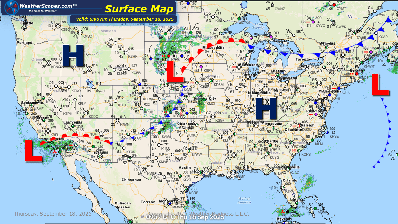 Today storms will develop out across the Plains into Iowa. Those storms will produce some gusty conditions and hail. Southern California into the Southwest will see some heavy rains and some localized flooding possible. Tropical Storm Gabriel has been named in the Atlantic. TS Gabriel still looking like it will not impact the US, but could impact Bermuda. Smoke and hazy conditions are still impacted the Pac NW and a majority of the Eastern US.