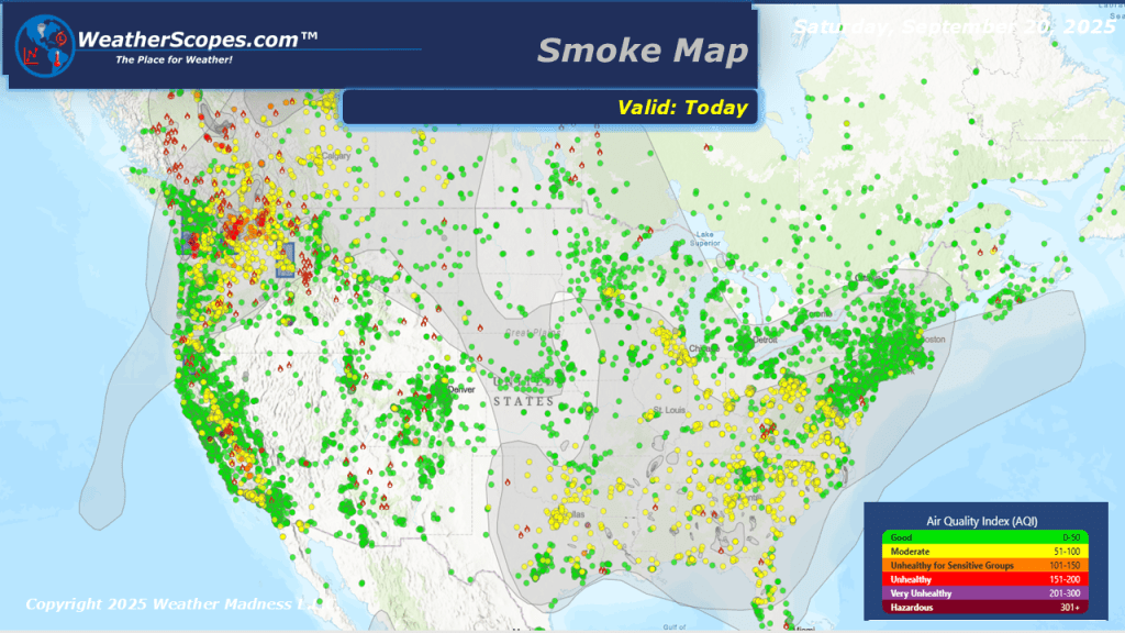 Today we will see some showers and thunderstorms out across the Plains and parts of the Midwest. Nothing going severe wise or anything that could pose a threat for some localized flooding. Eastern part of the US and Pacific NW still dealing with smoky and hazy conditions from the wildfires.