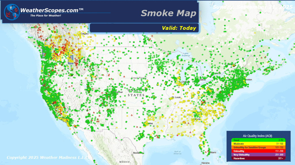 Today we will see some showers and thunderstorms out across the Plains, Great Lakes and into the Tennessee Valley. Some storms later tonight could become severe out in the Plains. Much of the Pac NW and eastern part of the US still dealing with smoky and hazy conditions from the wildfires. TS Gabrielle is tracking in the Atlantic looking to pass just to the east of Bermuda on Monday.