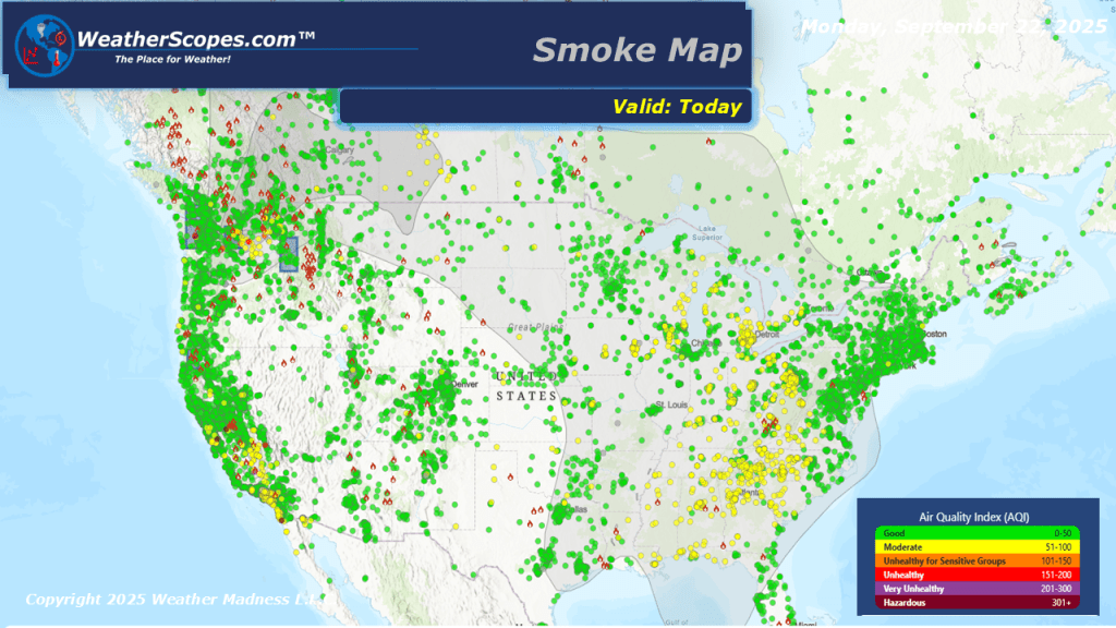 Today we will see some severe storms develop across the Plains and into parts of the Midwest. Later today and into tonight some gusty storms will develop out across the Ohio and Tennessee Valley’s bringing some gusty conditions. Still dealing with wildfire smoke in much of the eastern US, with the Southeast dealing with some poor air quality. Tropical Storm Gabrielle has strengthened to a Category 1 hurricane and will pass to the east of Bermuda today. Bermuda looks to see some rain, winds, and high surf from Gabrielle. The NHC is watching two areas of interest that could develop over the next few days. We will have to keep an eye out in the Atlantic this week.