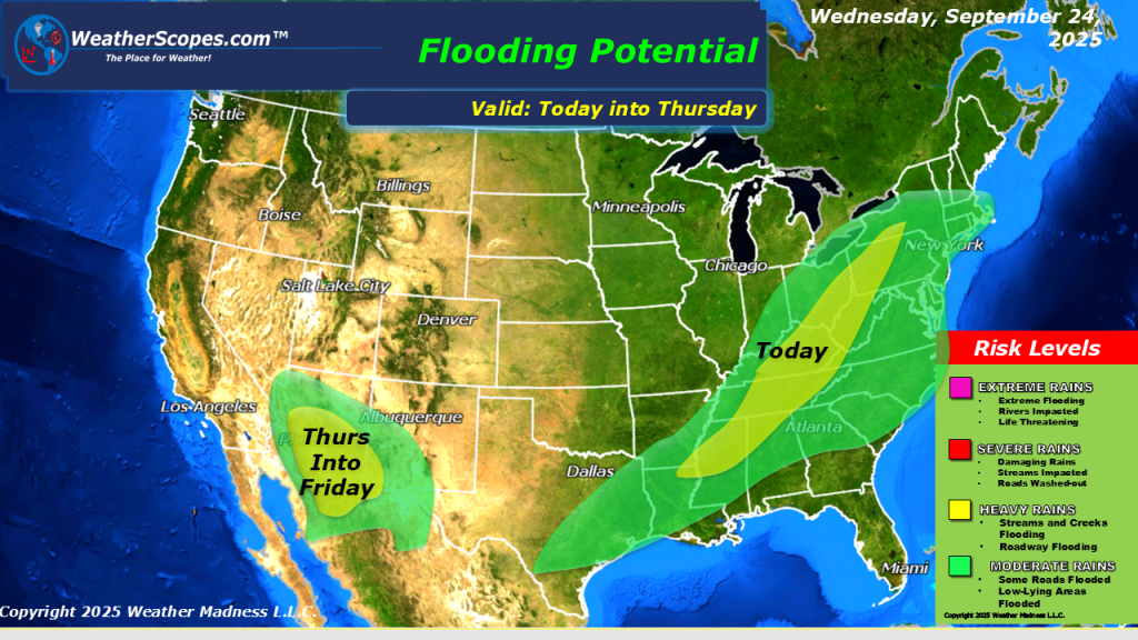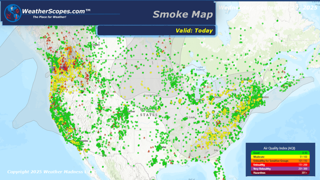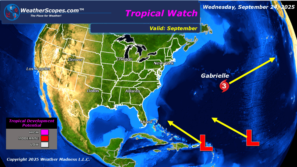 Today we will see showers and thunderstorms out across the Southeast. The Tennessee and Mississippi Valley’s will see some gusty storms develop and some of those could become severe. With the storms the Southeast will see a chance for some localized flooding, even after drought conditions. The eastern US still dealing with smoky and hazy conditions from the wildfires. Hurricane Gabrielle has passed and is in the Atlantic, while the NHC is watching two areas of interest in the Atlantic. These areas of disturbances have a good chance to form into something over the next few days. We will have to keep watching the Atlantic to see if there will be an impact to the US.